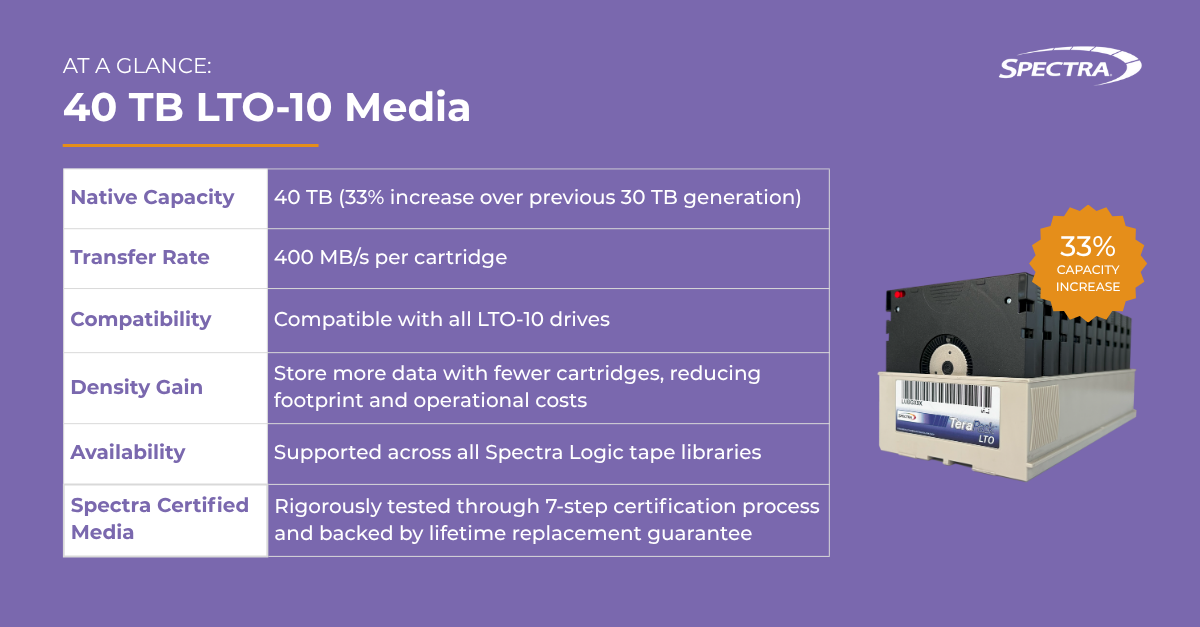 With 40 TB LTO-10 media, the industry takes another leap forward — extending tape’s unmatched value in long-term data protection and cyber-resilience while Spectra reaffirms its leadership in archive density, sustainability, and affordability.