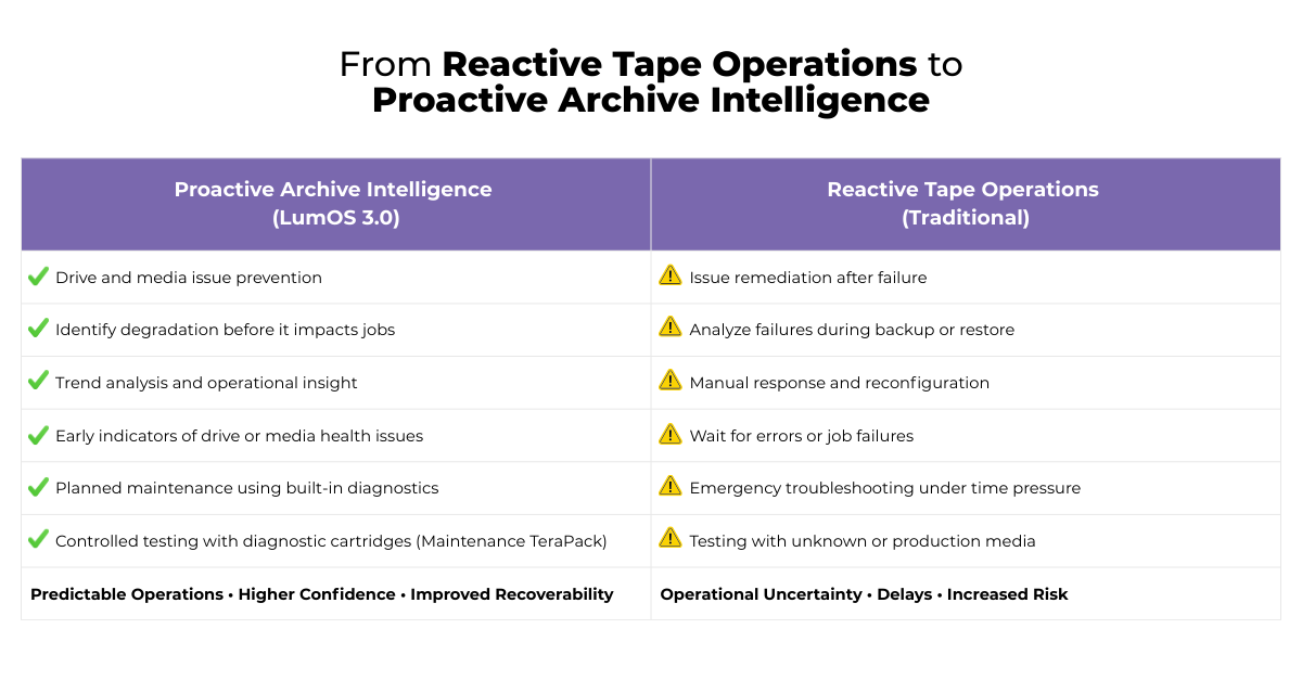 LumOS 3.0 reflects a broader direction: more automation, more intelligence, and more confidence in long-term operations. As tape environments grow, the most critical capability isn’t just storing data — it’s ensuring that data remains consistently recoverable and that the infrastructure stays healthy over years of use.