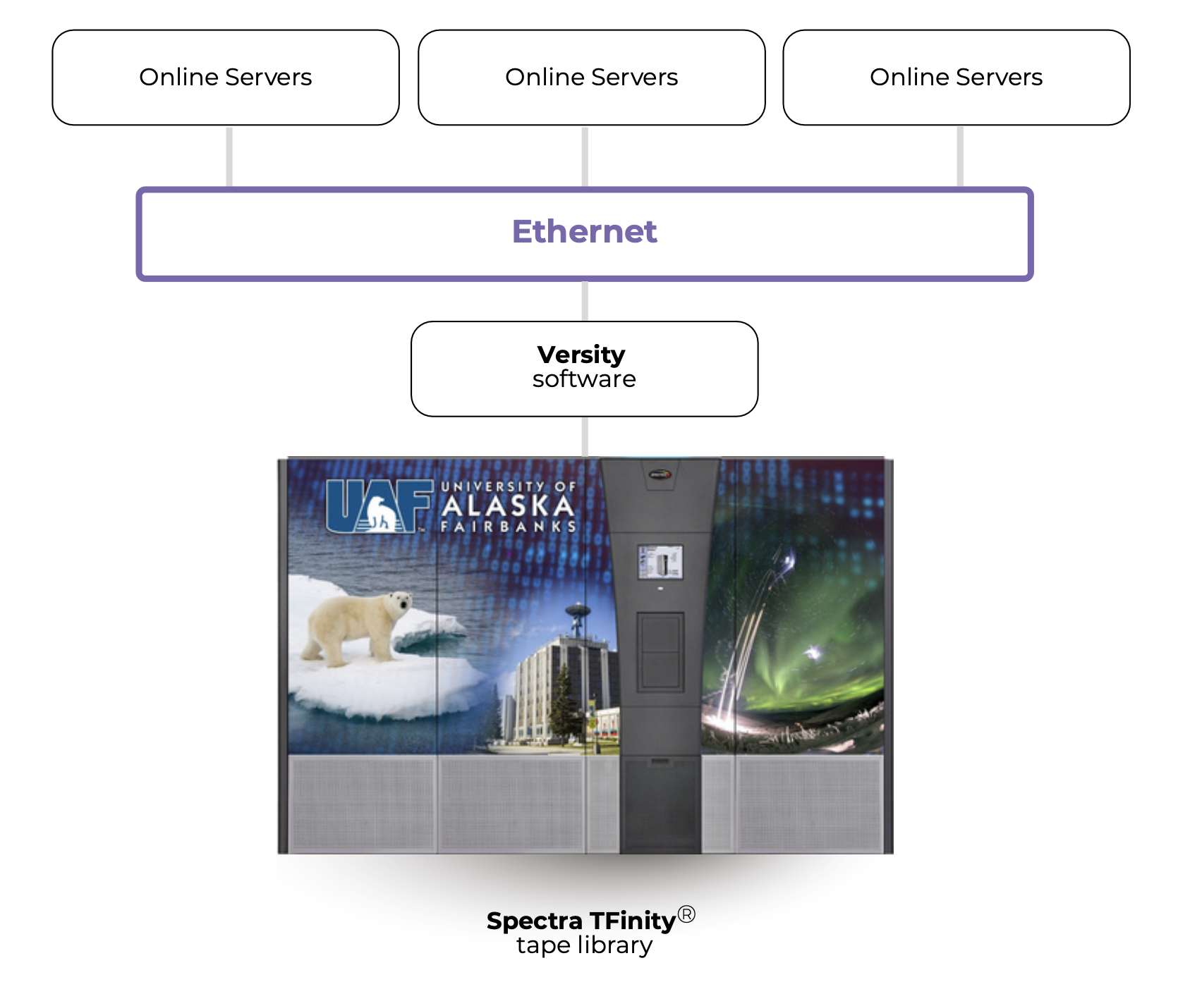 Spectra Logic partnered with UAF to protect the institution’s investment in TS1140 and TS1160 drives and existing 3592 media — several thousand tapes. Spectra re-sledded, tested, and migrated a total of ten drives into a four-frame Spectra TFinity® tape library integrated with Versity software. The TFinity enables a flexible, multi-media environment supporting both TS and LTO technology.